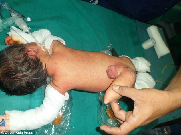 Această „coadă” era de fapt un frate geamăn parazit, care nu s-a dezvoltat normal în timpul sarcinii şi a fost asimilat de trupul fratelui care a supravieţuit.