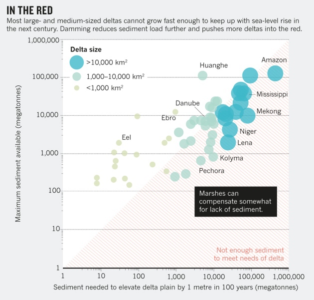 Însă nu toate deltele vor dispune de suficiente sedimente pentru a se ridica cu peste 1 metru faţă de nivelul mării în următorii 100 de ani, după cum arată şi acest grafic realizat de cercetători. Delta Dunării, conform graficului, se află undeva la limită, între zona roşie şi cea albă.