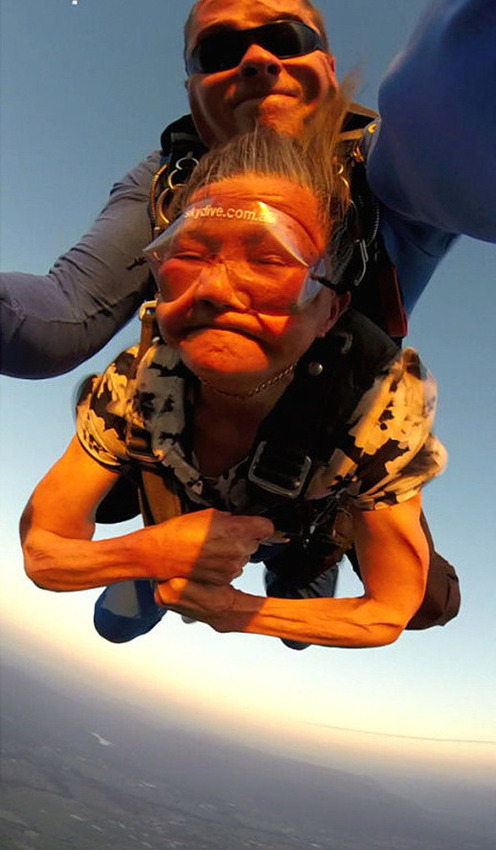 Săritura în tandem a avut loc de la o înălţime de aproape 4 km. După ce a trecut testele medicale obligatorii, bunicuţa a sărit din avion alături de un antrenor, declarând senin că „nu e mare scofală, e doar o săritură.”