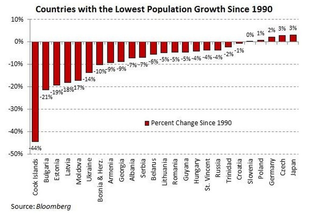 După cum se poate vedea, singurele regiuni unde s-a înregistrat o scădere demografică sunt statele din fostul bloc comunist. Scăderea dramatică a apărut imediat după prăbuşirea regimului comunist.