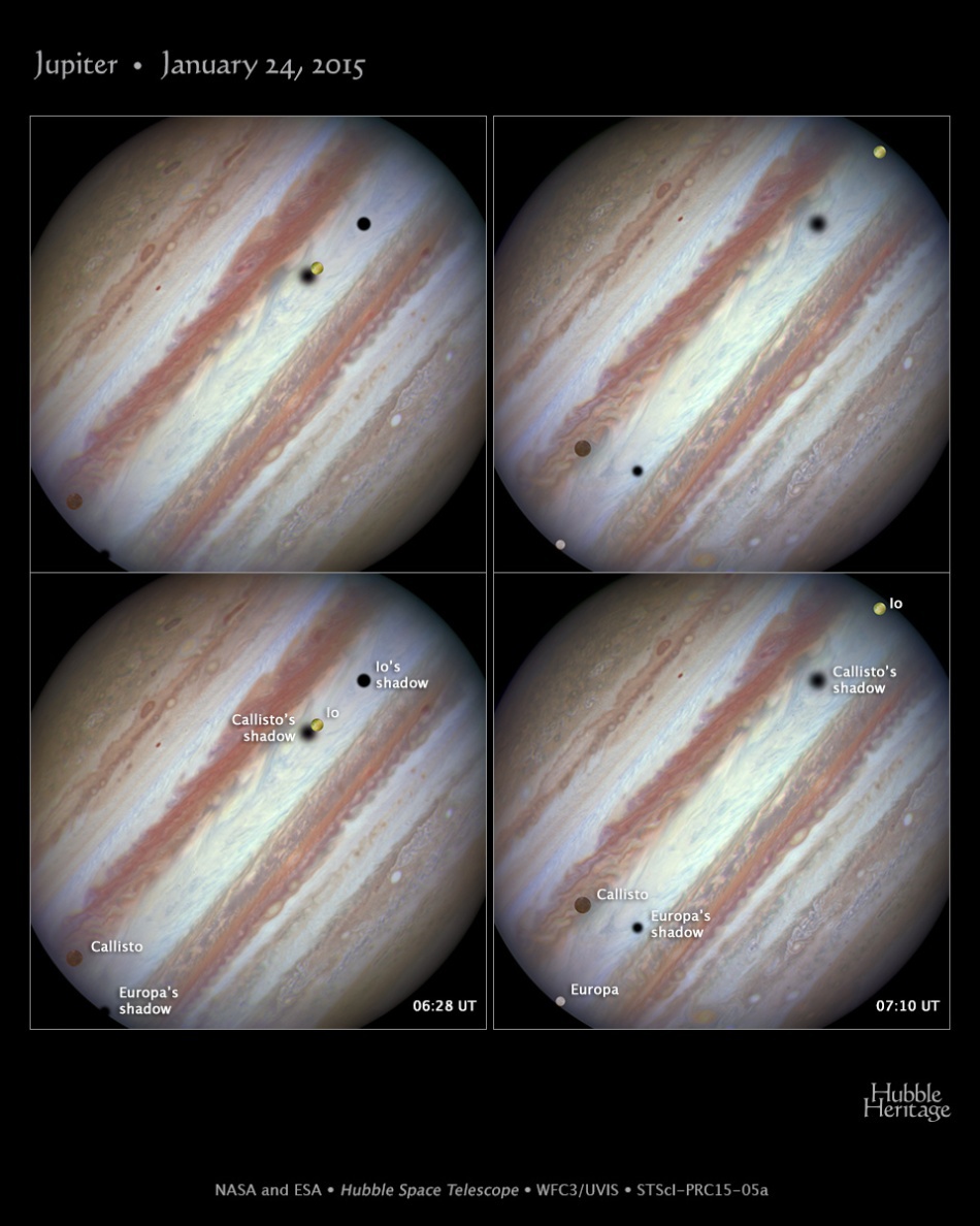 Într-o primă imagine apar Callisto şi Io, ca şi umbrele lor lăsate pe suprafaţa planetei Jupiter. Există o distanţă foarte mare între Callisto şi umbra sa, datorită orbitei mai îndepărtate a acestui satelit. În acea primă imagine, astronomii pot doar să ghicească sosirea în acelaşi plan a satelitului Europa, o venire anunţată de umbra sa, în stânga fotografiei.