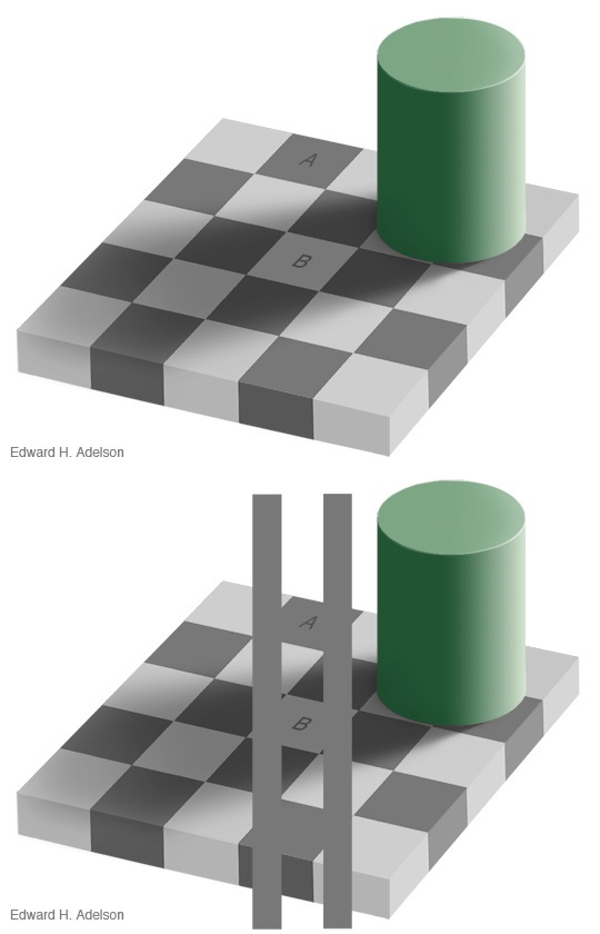Pe tabla de şah de mai jos, pătratul ”A” pare mult mai închis la culoare decât pătratul ”B”. În realitate, după cum se poate observa pe tabla din partea de jos a imaginii, ”A” şi ”B” au aceiaşi culoare. Dacă introduceţi imaginea într-un program de editare de fotografii, acesta va confirma că este vorba despre RGB 120-120-120.