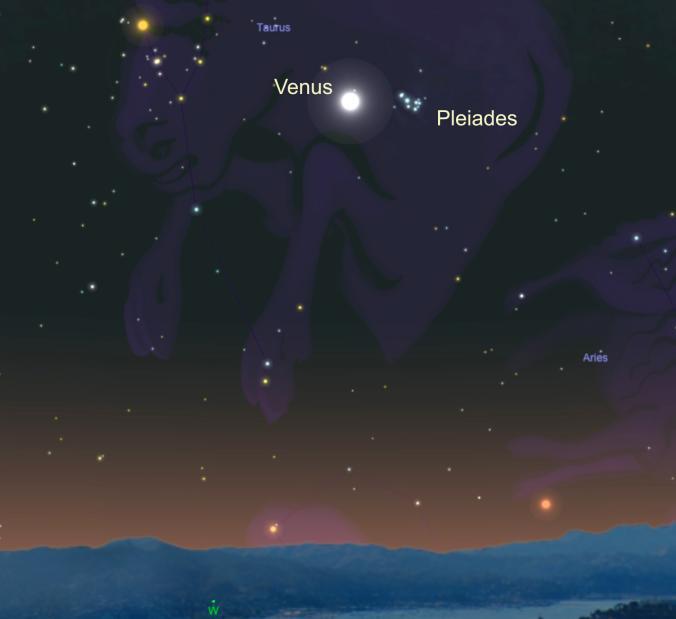 Sâmbătă, la apus, Venus va trece foarte foarte aproape de Pleiadele sau Cele şapte surori, un roi stelar format din circa 3.000 de stele.