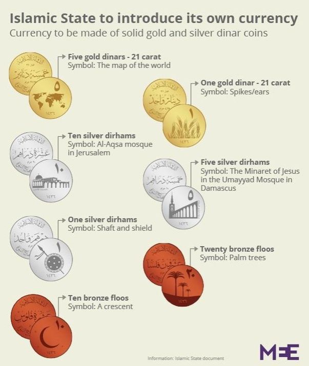 Statul Islamic a anunţat în noiembrie că va începe să pună în circulaţie propria sa monedă în zonele pe care le controlează, în efortul de a se „emancipa de sistemul economic global satanic”.