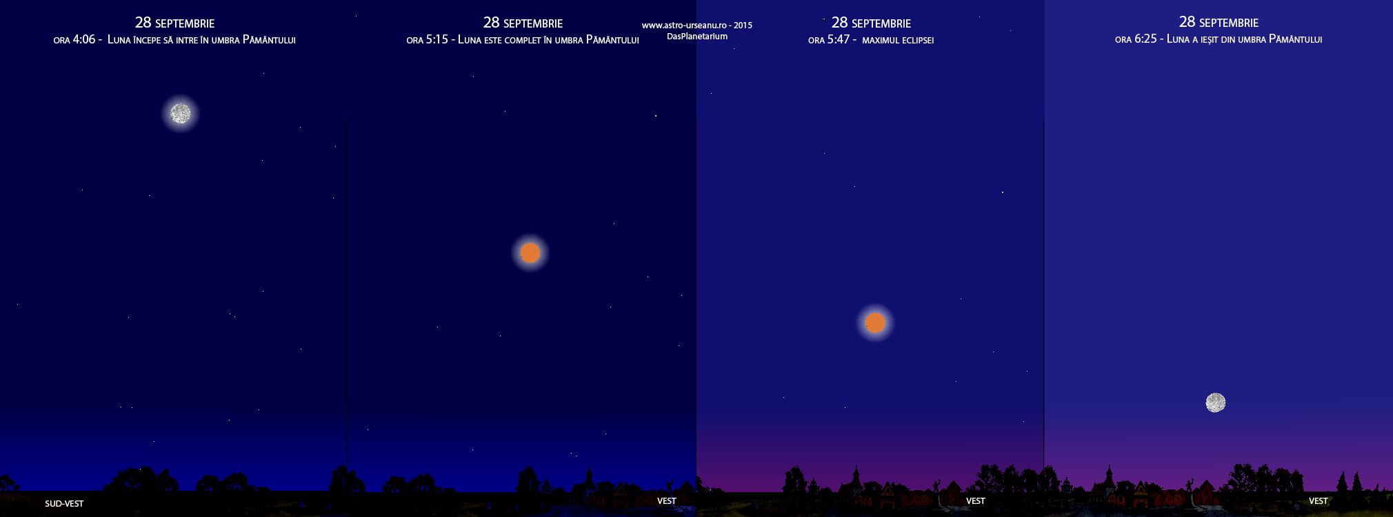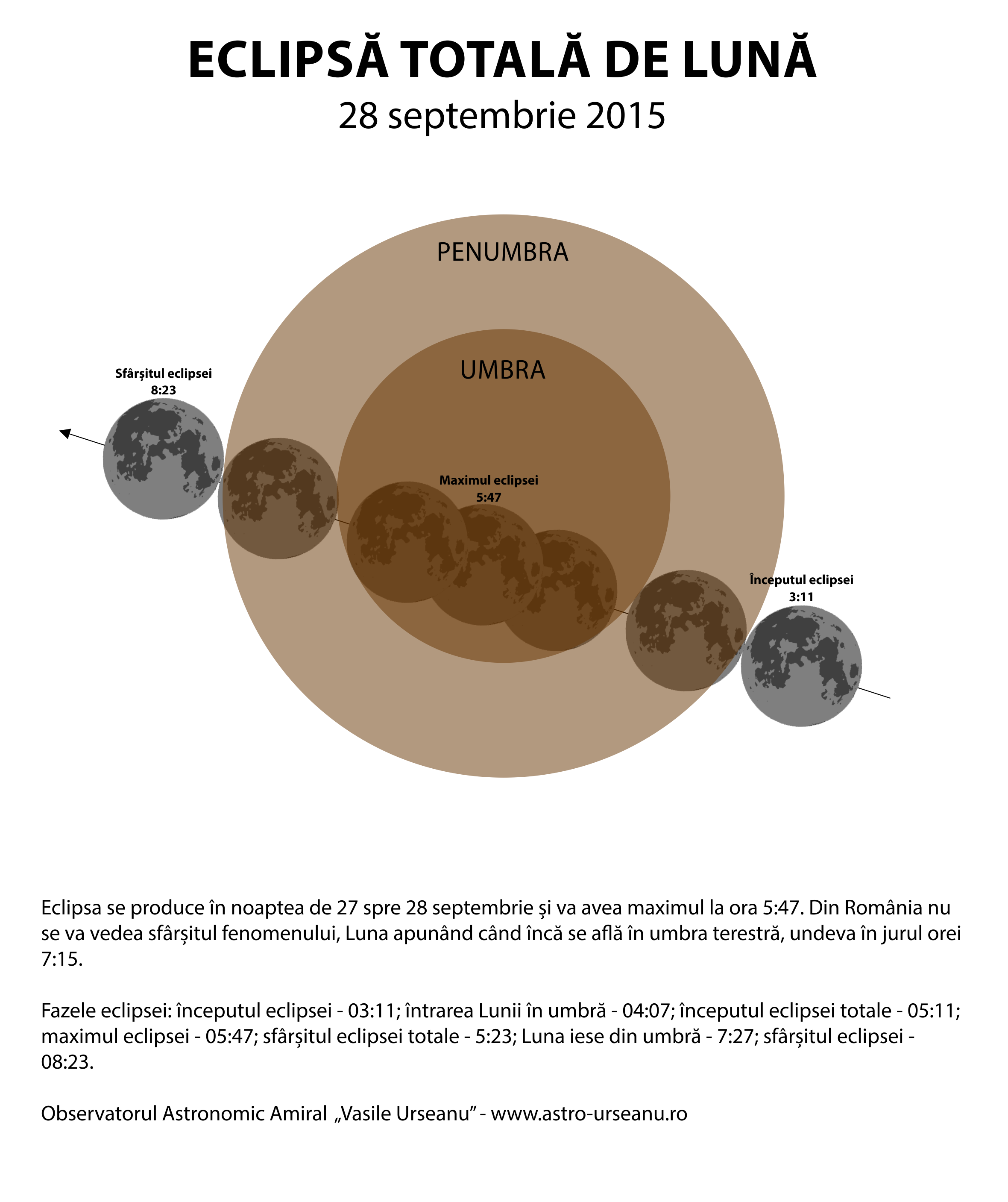 Acest fenomen astronomic va fi vizibil parţial şi din România. „În noaptea de 27 spre 28 septembrie se produce o eclipsă de Lună, care va începe la ora 03:11, va avea maximul la 05:47 şi se va termina la 08:23”, se spune pe site-ul Observatorului Astronomic „Amiral Vasile Urseanu”.