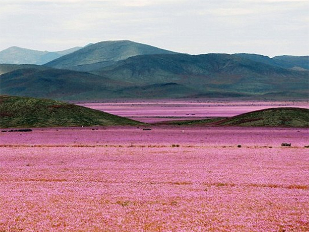 O dată la 5-7 ani, deşertul Atacama din Chile este “împodobit” cu un covor de o culoare roz uimitoare, ceea ce face ca întreg peisajul arid să se transforme.