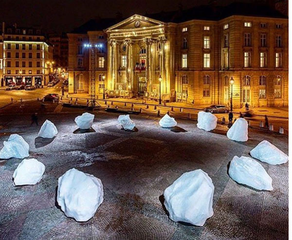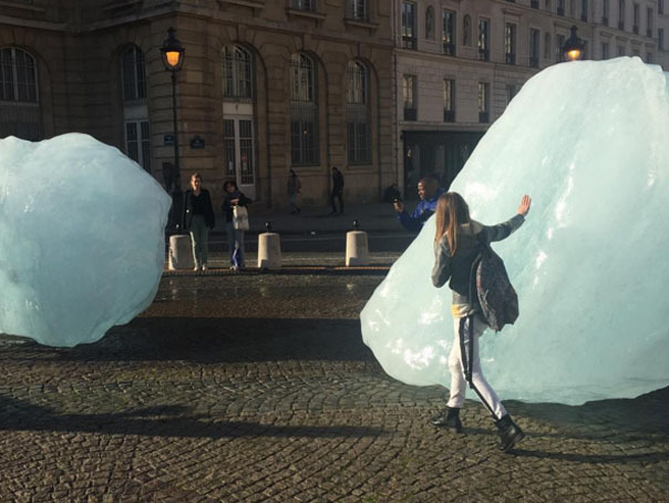 Din Danemarca blocurile de gheaţă au fost aduse în Franţa, unde au fost aranjate sub forma unui ceas în Piaţa Republicii.