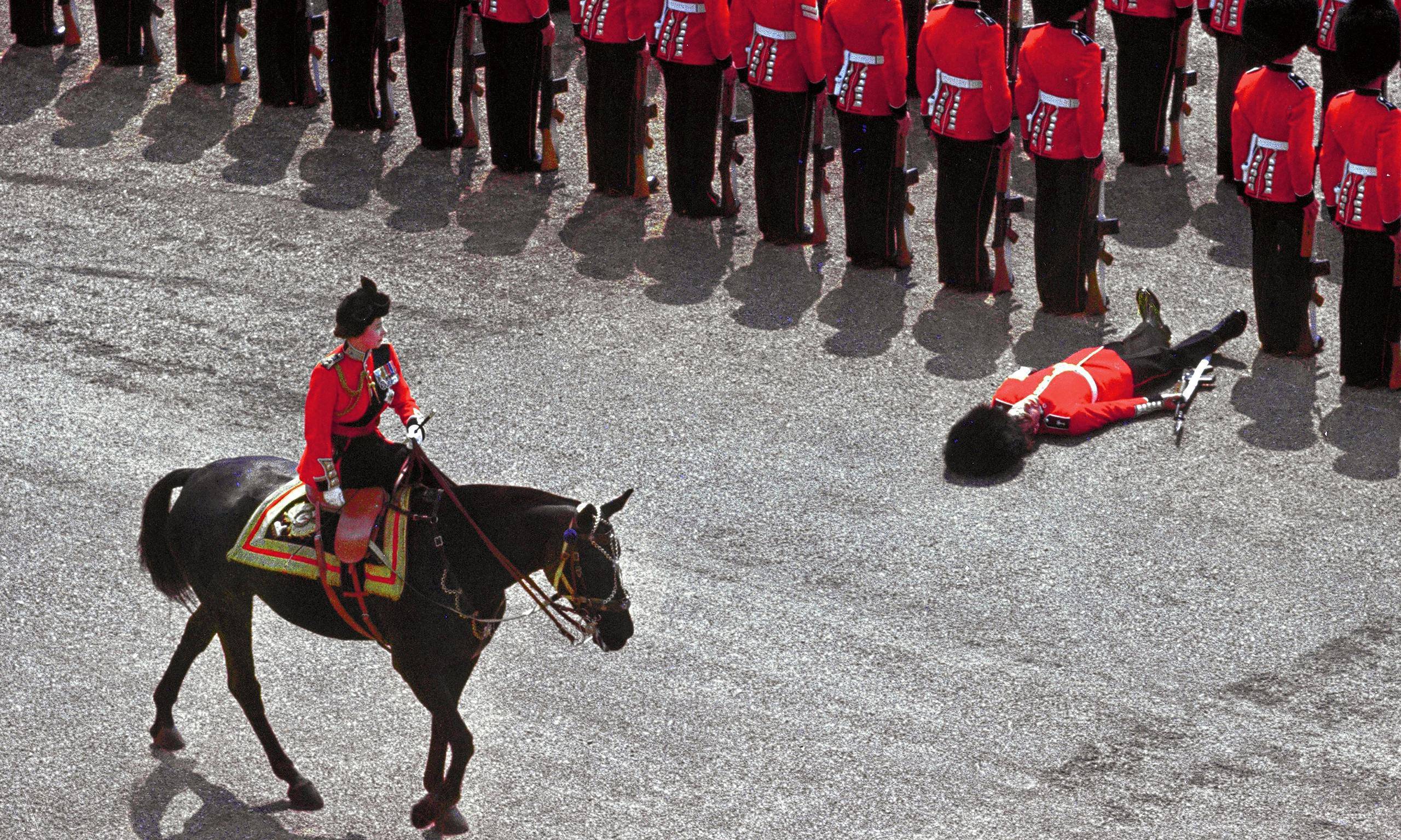 Un soldat din regimentul de infanterie britanic leşină în timpul unei parade (1970)