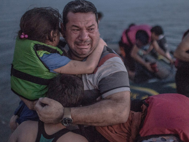 15 august 2015 – Un refugiat ce-şi ţine copiii în braţe plânge de fericire, după ce vasul în care se afla a ajuns pe ţărmul insulei greceşti Kos. Insulele din Marea Egee au fost luate cu asalt de refugiaţi, majoritatea sirieni.
