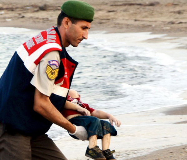 3 septembrie 2015 – Imagini şocante cu cadavrul unui băieţel sirian adus de apă pe o plajă din apropierea staţiunii turce Bodrum, după ce ambarcaţiunea cu care el şi familia sa încercau să ajungă în Grecia s-a scufundat, au fost publicate de presa străină şi pe reţelele sociale, generând dezbateri la nivel mondial.