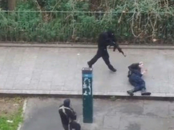 În imaginea de mai jos, un bărbat mascat aleargă cu o armă spre o victimă în timpul atacului terorist ce a vizat sediul Charlie Hebdo. Între 7 şi 9 ianuarie 2015, 17 oameni au fost omorâţi în atacurile de la Charlie Hebdo, un magazin şi în Montrouge, o suburbie din Paris.