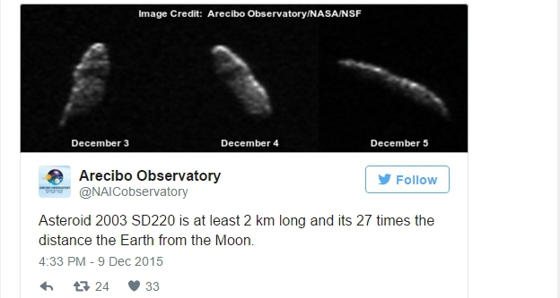 Din păcate, din cauza distanţei destul de mari, asteroidul va putea fi văzut de pe Pământ numai cu un telescop radio, precum cel de la Observatorul Arecibo din Puerto Rico, unde au fost şi adunate toate aceste informaţii.
