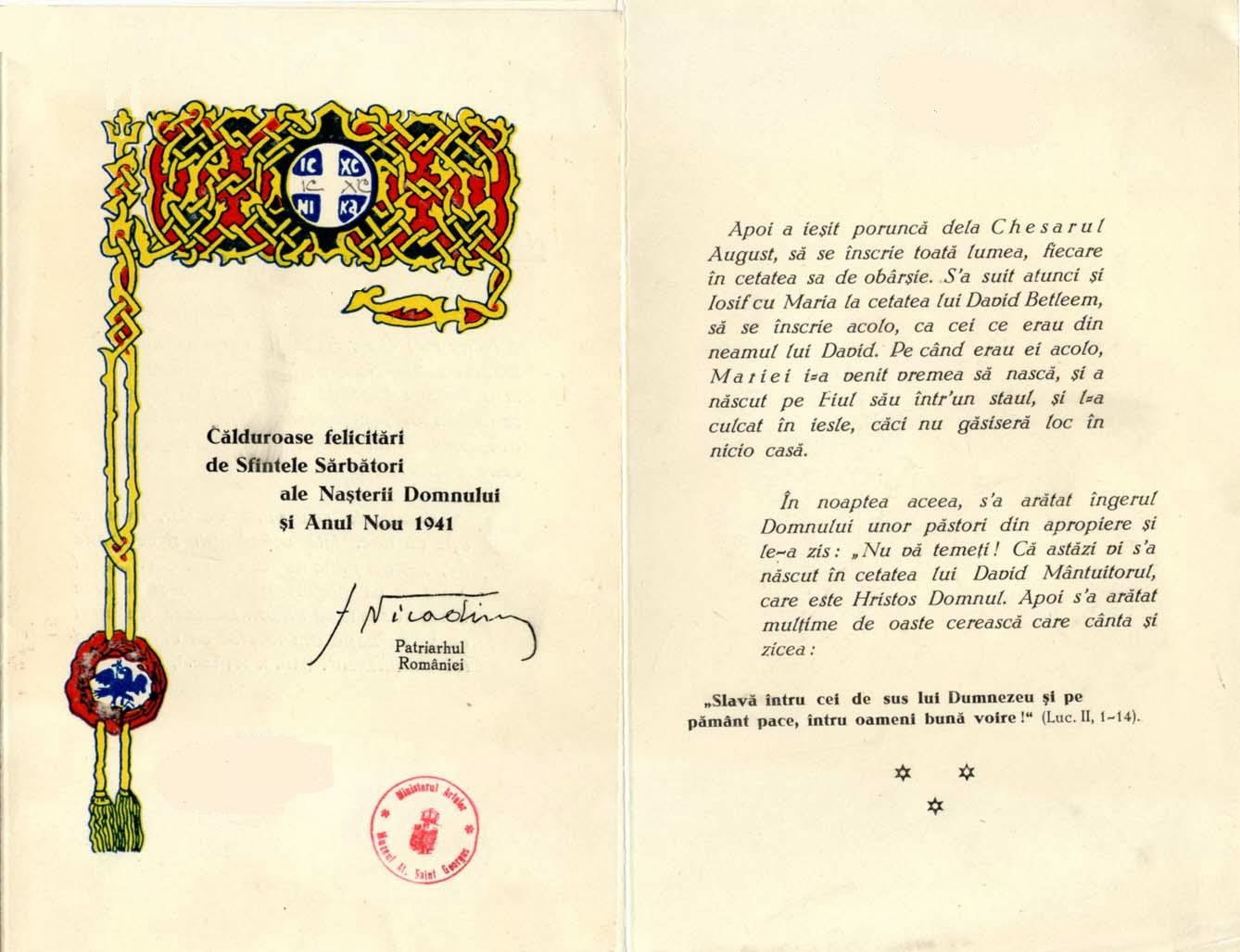 Felicitare de Crăciun trimisă de Patriarhul Nicodim în 1941