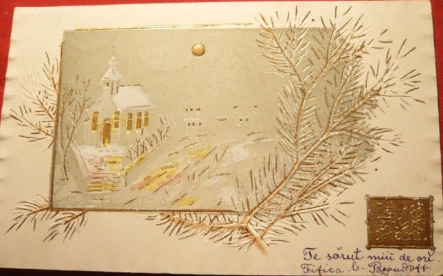 Felicitare de Crăciun din 1927, pictată manual şi aurită