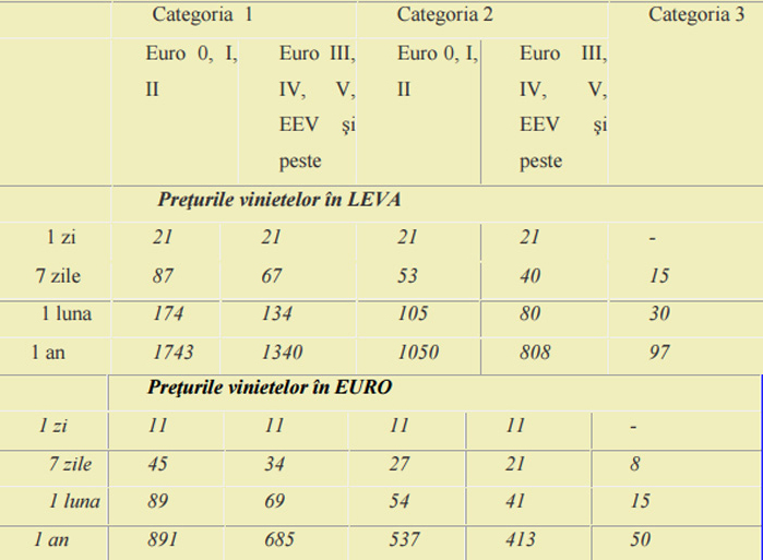 Preţurile practicate pentru vinietă, valabile şi în 2016, sunt următoarele: