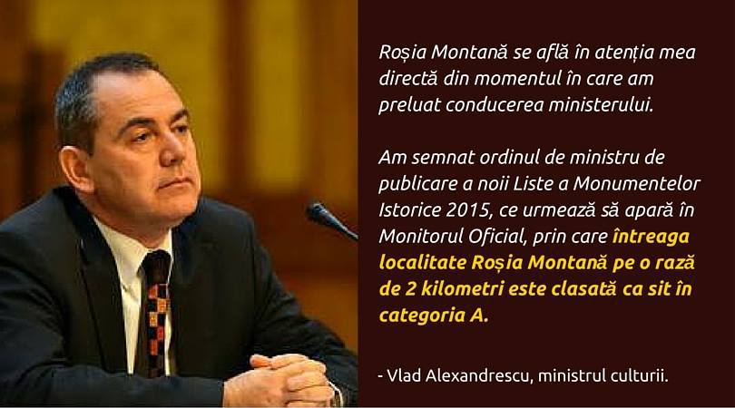 La data de 30 decembrie 2015, ministrul Culturii, Vlad Alexandrescu, a semnat ordinul de ministru de publicare a Listei Monumentelor Istorice pentru anul 2015. În cadrul acesteia se menţionează faptul că întreaga localitate Roşia Montană (jud. Alba), pe o rază de 2 kilometri, a fost clasată ca sit în categoria A.
