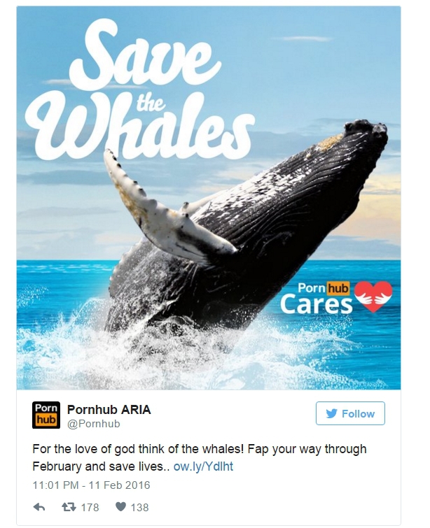 Pentru a sărbători Ziua Mondială a Balenelor, pe 13 februarie, Pornhub a promis să doneze un cent pentru fiecare 2.000 de videoclipuri vizualizate pe site-ul lor între data de 8 şi 29 februarie. Toate încasările vor merge spre orgnizaţia non-profit de conservare a cetaceelor – Societatea Cetologică Moclips (MCS) .