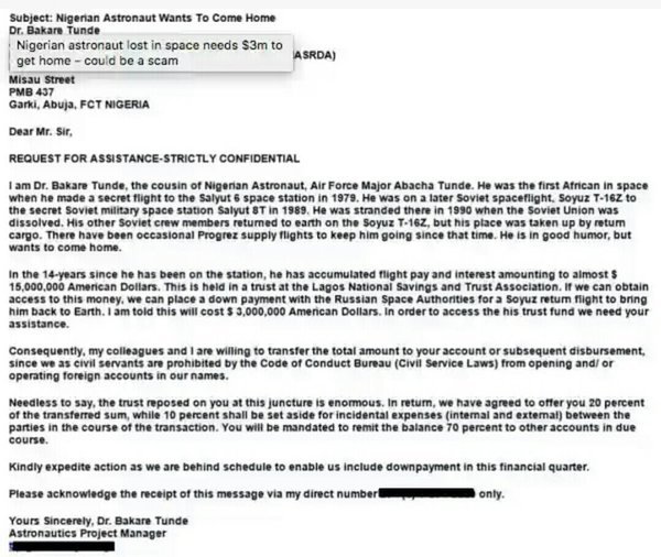 Mai multe persoane au primit prin e-mail un mesaj, în care erau rugate să-l ajute pe astronautul nigerian Abacha Tunde. Conform textului, acesta se afla în spaţiul cosmic încă din anul 1989, când staţia sovietiecă Salyut 6, pe care el se afla, a ieşit de pe orbita Pământului. „Echipa de salvare” le solicita celor cărora li se adresa 3 milioane de dolari, pentru ca Tunde să revină pe Terra.