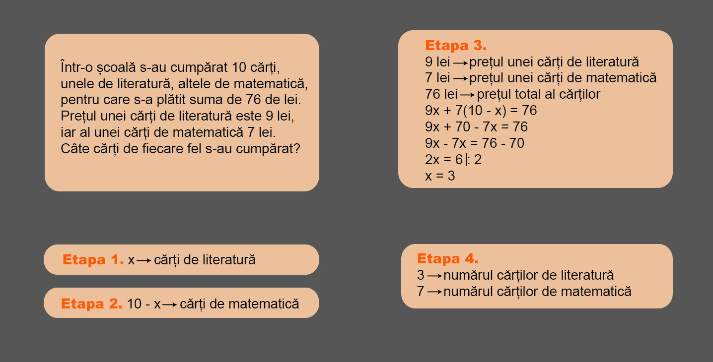 Notăm cu x numărul cărţilor de literatură. Dacă în total s-au cumpărat 10 cărţi, iar x dintre ele sunt de literatură, numărul cărţilor de matematică este: 10-x.