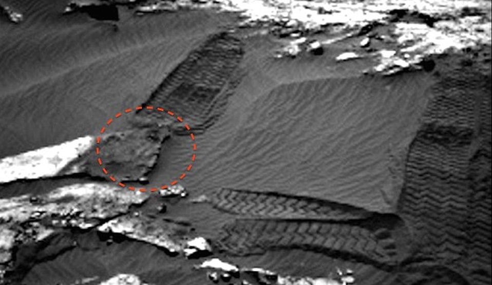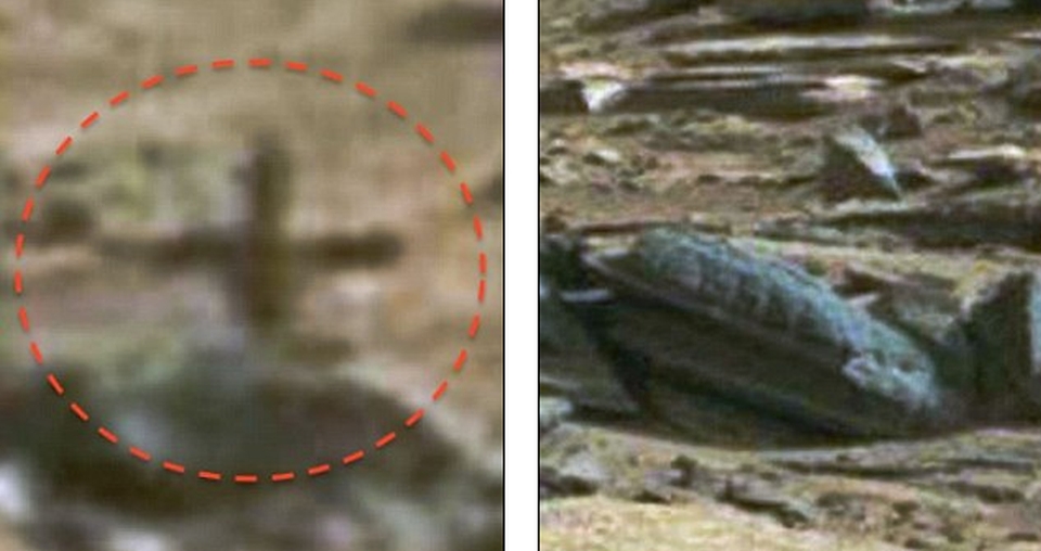 Mai multe forme neobişnuite au fost observate de un vânător de OZN din Franţa, într-o fotografie făcută de roverul Curiosity al NASA pe suprafaţa planetei Marte. OZN-iştii consideră că în aceste imagini apare un crucifix.