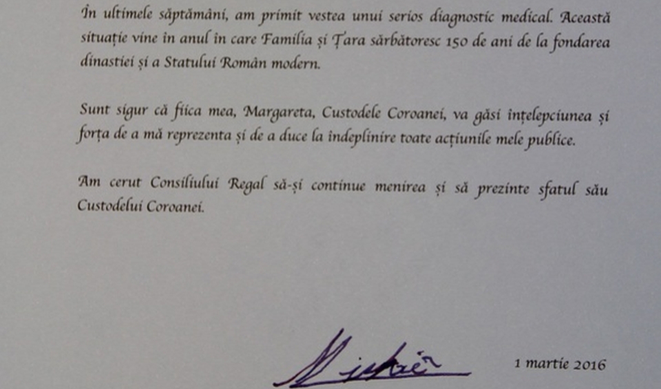 „În ultimele săptămâni, am primit vestea unui serios diagnostic medical. Această situaţie vine în anul în care Familia şi Ţara sărbătoresc 150 de ani de la fondarea Dinastiei şi a Statului Român modern. Sunt sigur că fiica mea, Margareta, Custodele Coroanei, va găsi înţelepciunea şi forţa de a mă reprezenta şi de a duce la îndeplinire toate acţiunile mele publice. Am cerut Consiliului Regal să-şi continue menirea şi să prezinte sfatul său Custodelui Coroanei”, a scris Regele Mihai, într-un mesaj semnat pe 1 martie.