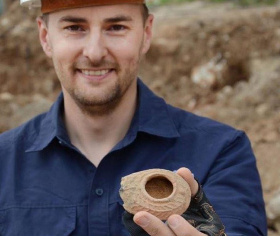 Responsabilul de săpături, Alex Wiegmann,  ţine în mână un suport pentru lumânare din epoca romană.Sursa foto:Israel Antiquities Authority