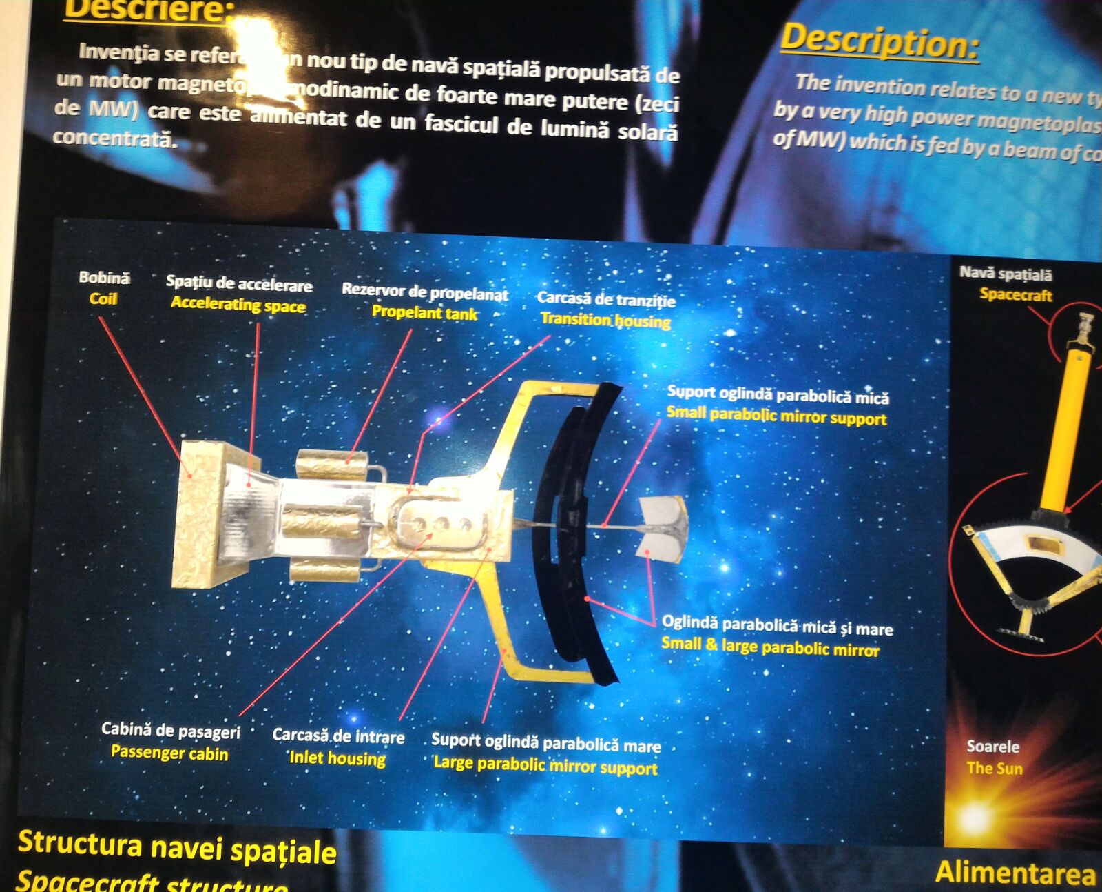 „Invenţia se referă la un nou tip de navă spaţială dotată cu motoare magnetoplasmodinamice de foarte mare putere, capabilă să transporte un mare număr de pasageri sau cantităţi mari de materiale dincolo de Marte, în alte planete din sistemul solar, inclusiv sateliţii naturali ai planetelor. Aceste motoare sunt cele mai puternice create până acum, care folosesc o energie electrică foarte mare care nu poate fi livrată de nicio centrală. Noi creăm un fascicul de lumină concentrată, pe care o dirijăm spre navă, iar astfel motorul poate fi alimentat cu putere electrică de ordinul megawaţilor. Se pot obţine nave spaţiale dotate cu motoare magnetoplasmodinamice foarte puternice care pot asigura călătorii în sistemul solar. Proiectul este patentat şi a fost prezentat la o conferinţă spaţială în Olanda în toamna anului trecut, iar acum la Pro Invent şi urmează să luăm legătura cu NASA şi Agenţia Spaţială Europeană, să vedem dacă sunt interesate să investească în acest proiect”, a spus Sandu.