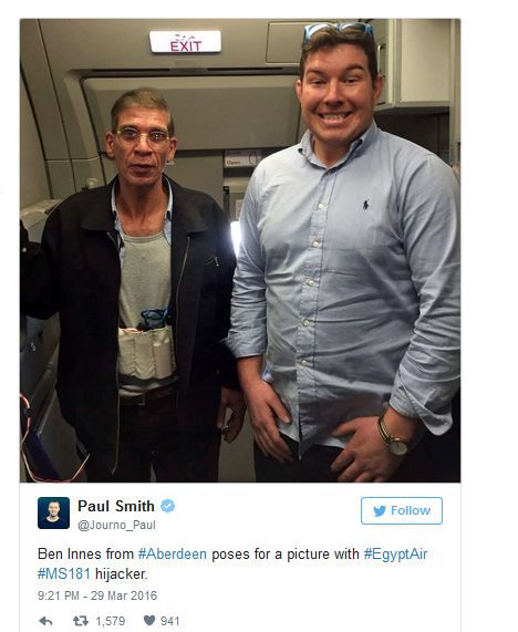 Printre pasagerii rămaşi în avion până la finalul negocierilor s-a numărat şi un britanic care locuieşte în Scoţia, Ben Innes, un tânăr de 26 de ani, de profesie auditor de siguranţă. În loc să fie speriat de gestul bărbatului care purta o centură cu explozibil falsă la brâu, acesta s-a încumetat să îi ceară să facă un selfie cu el. Motivul invocat de el: a vrut să vadă de aproape dacă bomba era reală sau nu. ”Nu aveam nimic de pierdut oricum”, a spus el.