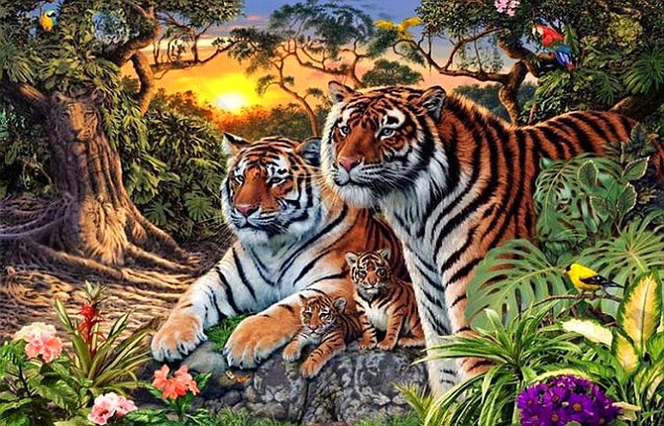 Imaginea, care pare să fi fost produsă ca un poster, are ilustrată în prim-plan doi tigri adulţi şi doi pui.