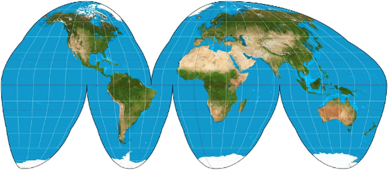 Proiecţia Goode (imaginea de mai jos) arată continentele, care sunt dimensionate în mod adecvat unul faţă de altul, dar cu multe întreruperi şi distorsiuni în ce priveşte distanţa.