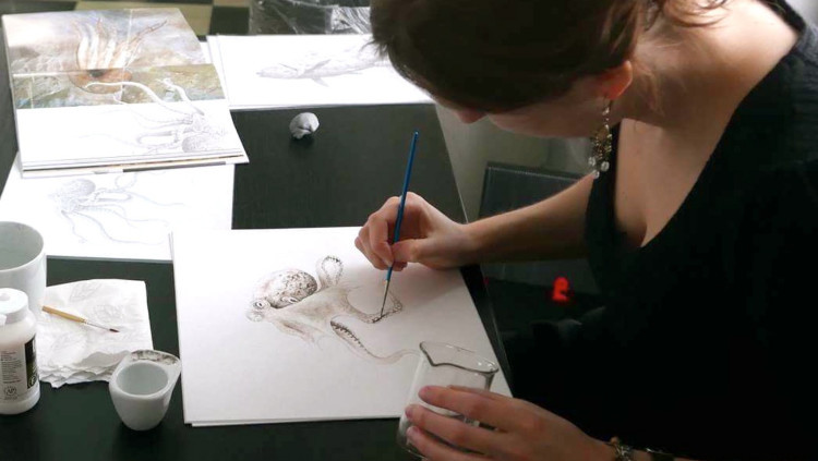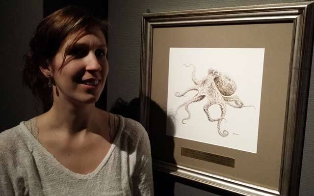 Artista specializată în animale sălbatice Esther van Hulsen şi Jørn Hurum, de la Muzeul de Istorie Naturală din Oslo, au desenat caracatiţa cu cerneala din săculeţul fosilei de moluscă.
