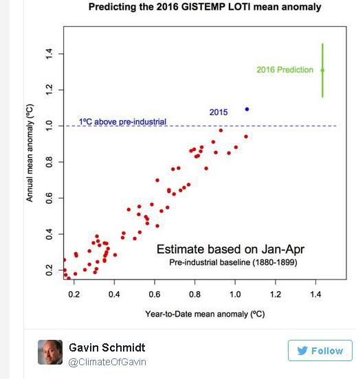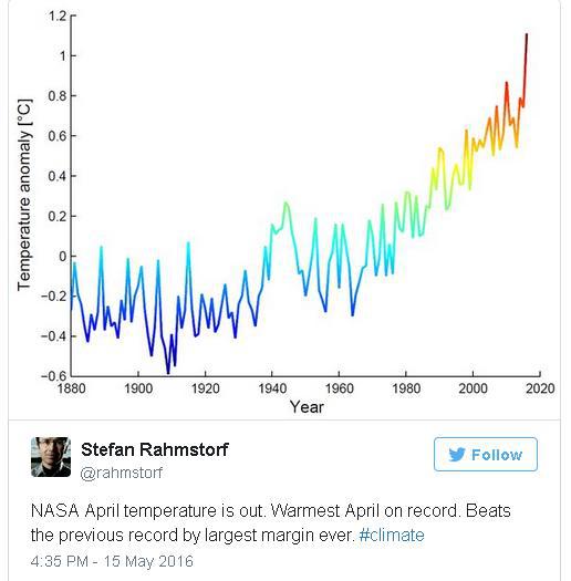 Cifrele publicate de NASA indică o temperatură globală a pământului şi a mării cu peste 1.11 grade Celsius mai mare decât media lunii aprilie în perioada 1951-1980. 2016 va fi probabil cel mai călduros an din istorie, susţin graficele.