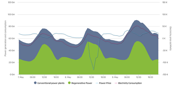 Pe data de 8 mai, în jurul orei locale 13:00, era raportat că sistemele de generare a energiei verzi din Germania furnizează 55 de gigawaţi din cei 63 de gigawaţi consumaţi, adică numai puţin de 87% din totalul utilizat. În momentul în care au fost adăugată cantitatea de energie rezultată din surse convenţionale, s-a constatat că producţia de electricitate depăşise cererea la nivel naţional Acest surplus indică faptul că, pentru scurt timp, preţurile la energie au fost de fapt negative. Prin urmare, consumatorii au fost efectiv plătiţi pentru a consuma energie electrică.
