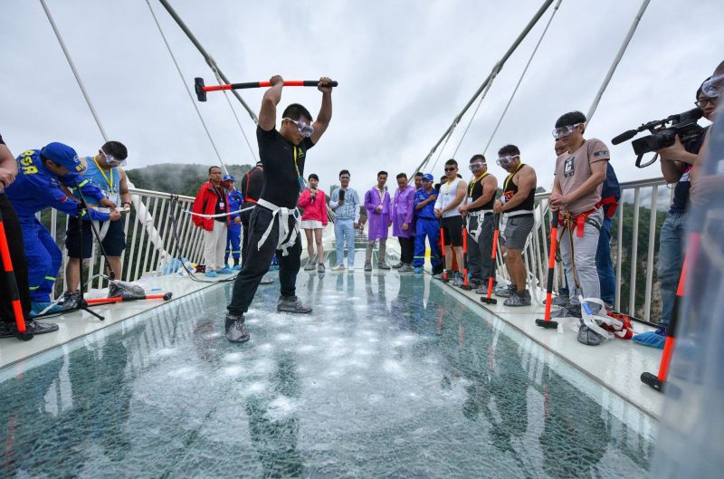 Pentru a testa rezistanţa podului, turiştii chinezi au utlizat ciocane care cântăreau 5,5 kilograme, însă ciocanul nu a reuşit decât să facă o crăpătură în pod.