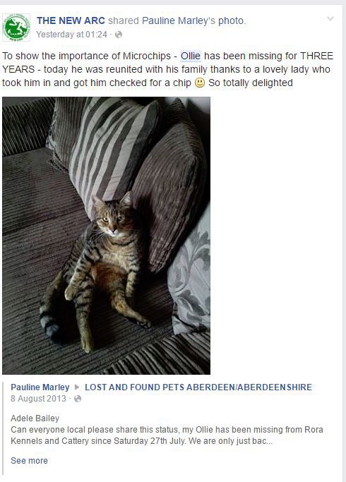 Finalul fericit se datorează unei organizaţii nonguvernamentale care a găsit motanul graţie microchip-ului pe care îl avea împlantat. Totuşi, chiar şi cei de la asociaţia respectivă au fost uimiţi să descopere că pisoiul salvat de ei era chiar Ollie.
