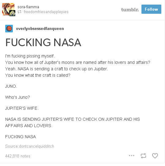 Cu cinci ani în urmă, când Juno şi-a început drumul către Jupiter, NASA a lăsat un comentariu legat de misiune, care a făcut referire la originile numelui navei: „Zeul Jupiter a desenat mulţi nori în jurul lui ca să ascundă răul, iar soţia sa, zeiţa Juno, a reuşit să treacă de nori şi să arate adevărata faţă a lui Jupiter.” NASA nu a precizat aici că „răul” se referă la adulter, dar este clar că ei ştiu ce fac.