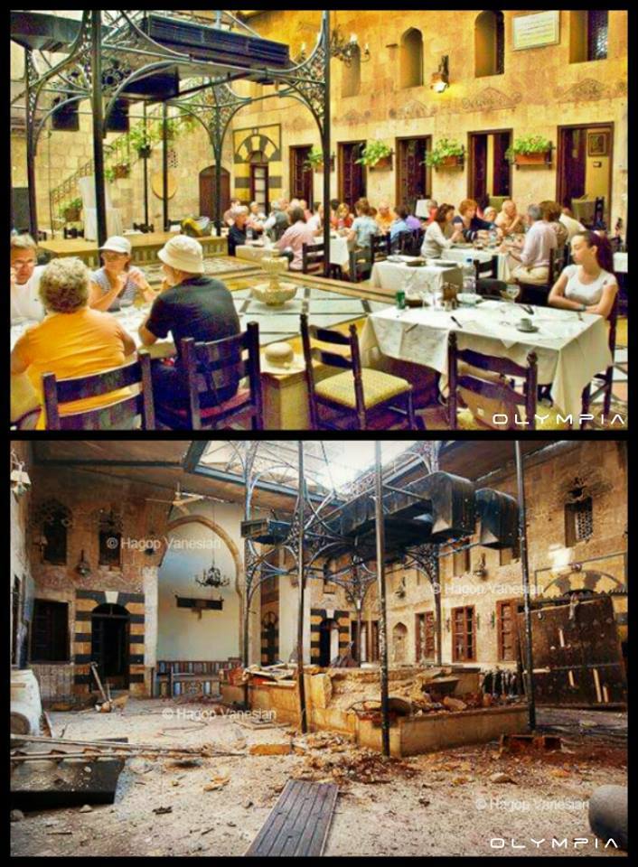 În următoarele imagini sunt comparate diferite locuri emblemă ale oraşului Aleppo, înainte şi după începerea războiului, acestea au fost publicate de Olympia Restaurant. Oraşul Aleppo se află în Patrimoniul UNESCO din 1986.