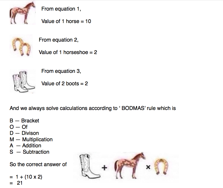 Dar iată şi răspunsul adevărat. Din prima ecuaţie, valoarea unui cal este egală cu 10. Din ecuaţia a doua, valoarea unei potcoave este egală cu 2. Iar din ecuaţia a treia, valoarea unei perechi de cizme este 2.