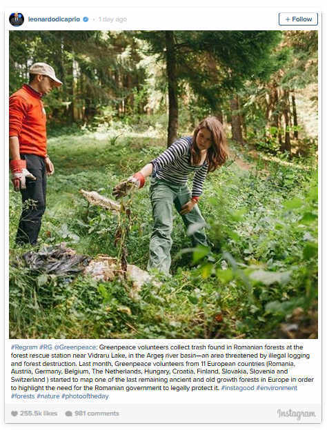 „Voluntarii Greenpeace colectează gunoiul găsit în pădurile româneşti, de la staţia de salvare a pădurile din apropierea Lacului Vidraru, bazinul hidrografic Argeş – o arie ameninţată de exploatarea forestieră ilegală şi de defrişări. Luna trecută, voluntarii Greenpeace din 11 ţări europene (România, Austria, Germania, Belgia, Olanda, Ungaria, Croaţia, Finlanda, Slovacia, Slovenia şi Elveţia) au început o mapare a uneia dintre ultimele păduri seculare din Europa, cu scopul de a sublinia necesitatea ca Guvernul român să o protejeze legislativ”, se arată în mesajul lui Leonardo DiCaprio, publicat pe contul său de Instagram.