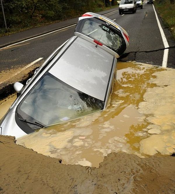 O femeie din Marea Britanie a rămas cu maşina blocată, la propriu, pe şosea. Automobilul ei s-a scufundat în asfaltul străzii după ce o ţeavă de apă spartă a afectat structura drumului. Imaginile fac înconjulul lumii.