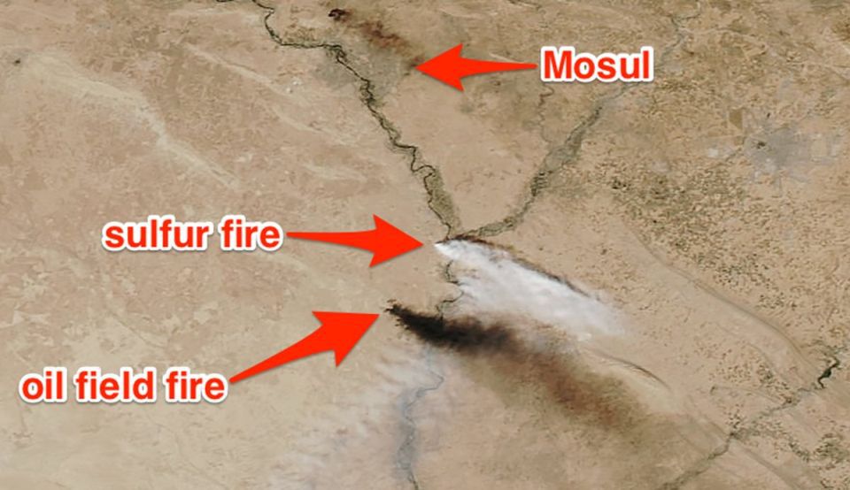 În timpul unei bătălii sângeroase pentru obţinerea controlului bastionului Mosul, ultimul deţinut de Statul Islamic în Irak, militarii au dat foc unei plante chimice, al cărui fum poate provoca sufocarea şi care emană gaze corozive. Acesta venea din zona minei de sulf Al-Mishraq, localizată la o distanţă de 24 de mile sud de Mosul, chiar în locul în care o coaliţie formată din forţe ale Statelor Unite, irankiene şi kurde încercau să avanseze spre Mosul.