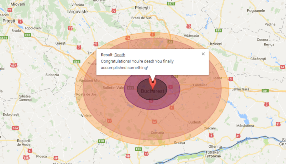 Pe site-ul WouldISurviveaNuke.com trebuie introdusă locaţia şi va fi afişată harta ce prezintă suflul exploziei şi cantitatea de radiaţii emisă.