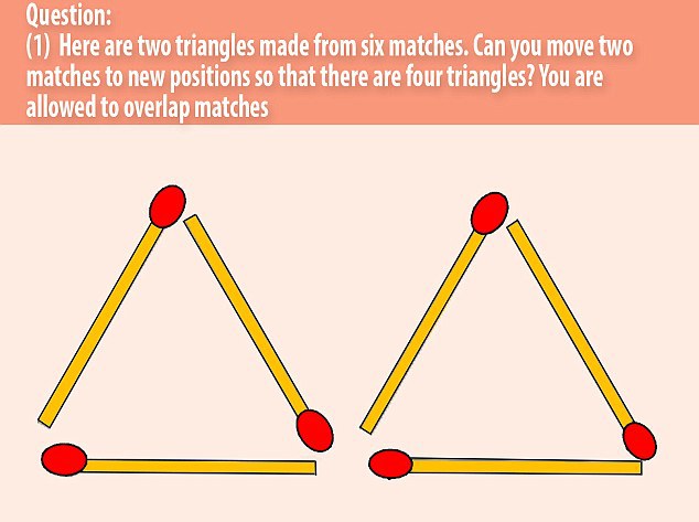 Problema triunghiurilor solicită transformarea celor două triunghiuri în patru, prin două mutări. Problema este concepută pentru a testa gândirea matematică a oamenilor, notează Daily Mail.