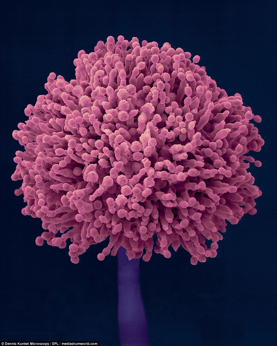 O serie de micrografii electronice ilustrează diferitele tipuri de organisme, precum Aspergillus flavus care se găseşte în covoare sau materialele de construcţie, notează Daily Mail.