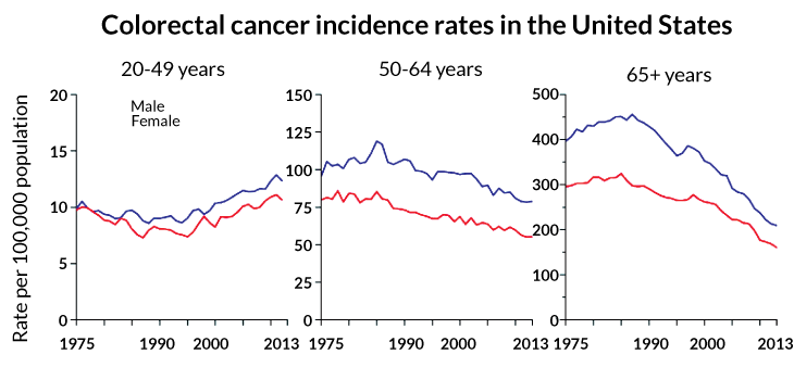 În ultimii ani, rata de ocurenţă a cancerului de colon şi a morţilor survenite în urma acestei afecţiuni au crescut în Statele Unite, mai ales în rândul tinerilor şi a persoanelor de vârsta a doua.