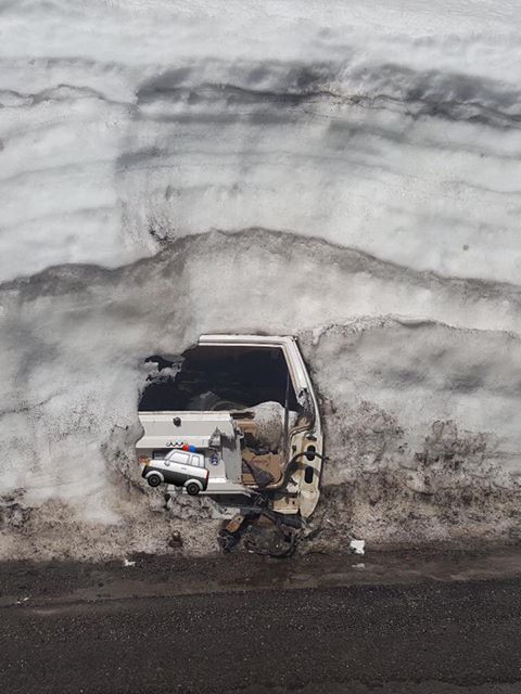 Poliţiştii au declarat că vehiculul a fost abandonat de către proprietari cu câteva săptămâni în urmă. Aceasta a fost descoperită după ce maşinile de deszăpezile au ajuns la ea. Forţele de ordine locale au declarat că vehiculul va rămâne în acelaşi loc până când zăpada se va topi.