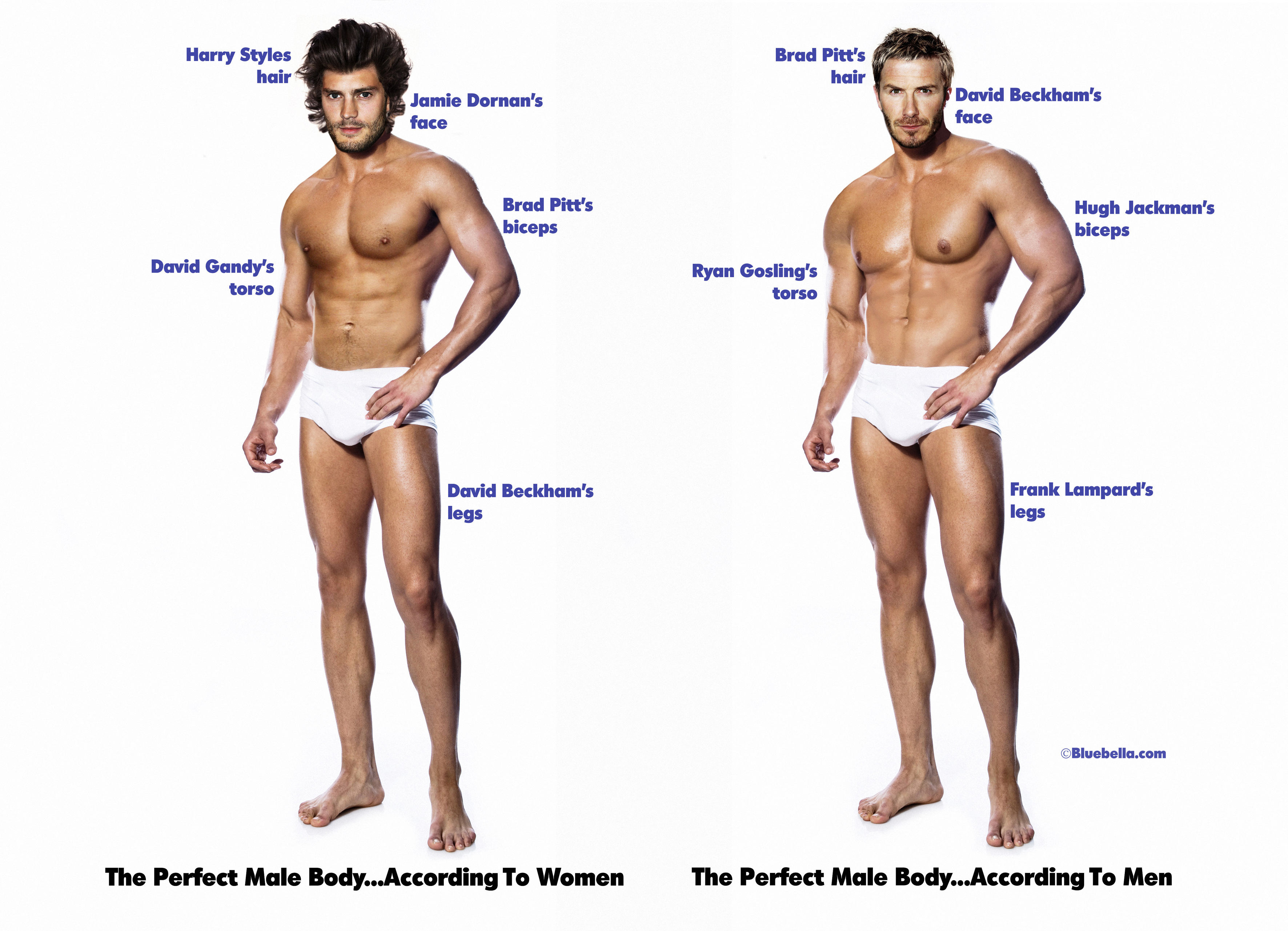 Bărbaţii au o viziune diferită asupra corpului masculin perfect. Acesta ar trebui să fie format din părul lui Brad Pitt, faţa lui David Backham, bustul lui Ryan Gosling, bicepşii lui Hugh Jackman şi picioarele lui Frank Lampard.