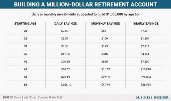 Pentru a ilustra simplitatea econimisirii de bani pe o perioadă îndelungată de timp, Bach a creat un grafic care detaliază sumele de bani necesare în fiecare zi, lună sau an, astfel încât atunci când împlineşti 65 de ani să deţii un milion de dolari, notează Mediafax.