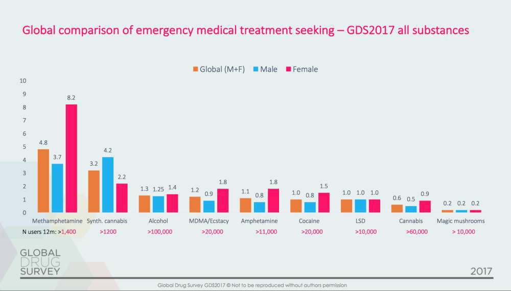 Astfel, în urma studiului s-a constatat că ciupercile halucinogene sunt cele mai sigure droguri, doar 0,2% dintre consumatori au ajuns la urgenţe. Spre exemplu, consumarea alcoolului a făcut ca 1,3% dintre persoane să ajungă cu probleme la spital (diagrama de mai jos).