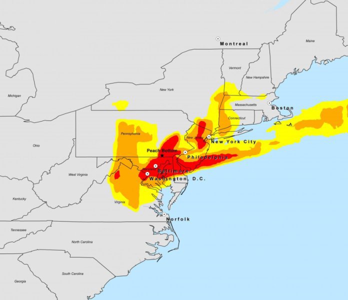 Cercetătorii au avut în vedere riscul impus de bazinele cu apă atât de umplute cu deşeu nuclear încât un incendiu poate elibera suficient material radioactiv încât să poată contamina o arie extrem de mare, întinzându-se pe mai multe state (imaginea de mai jos).